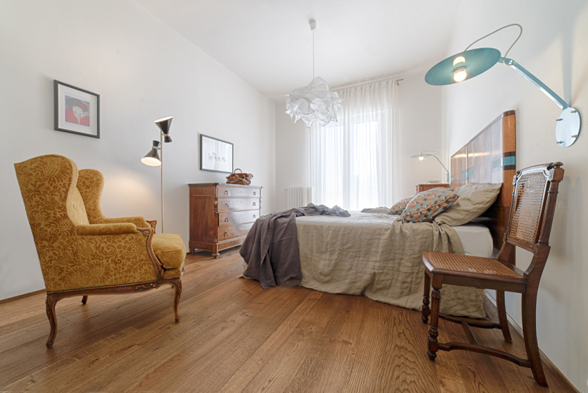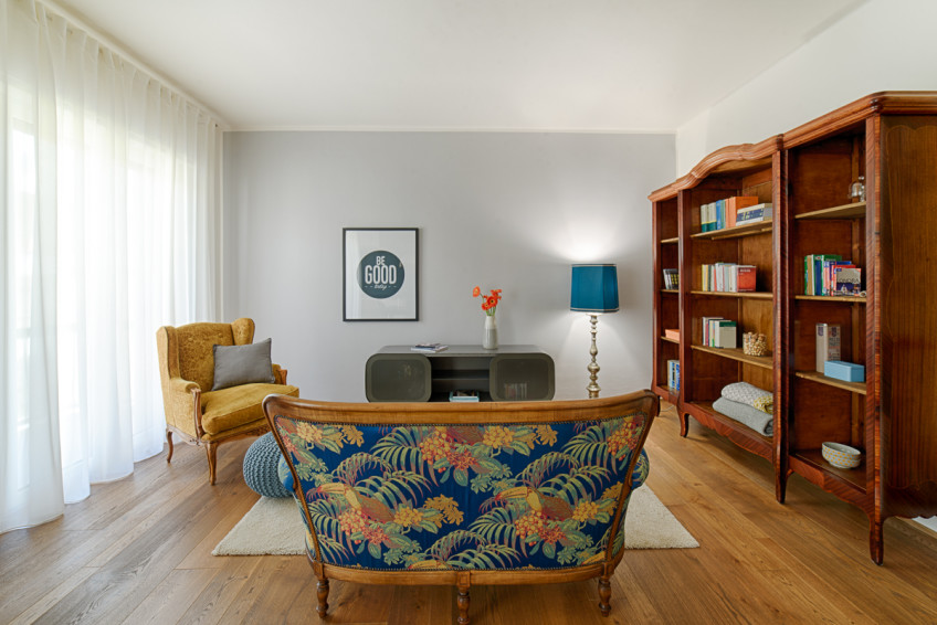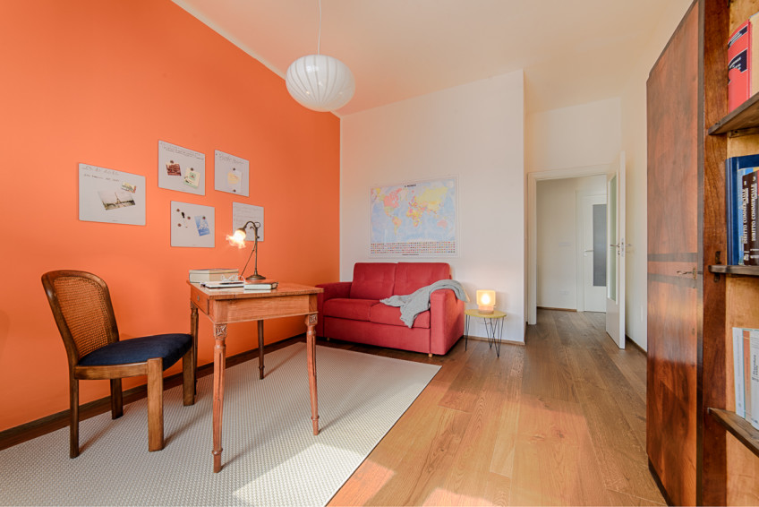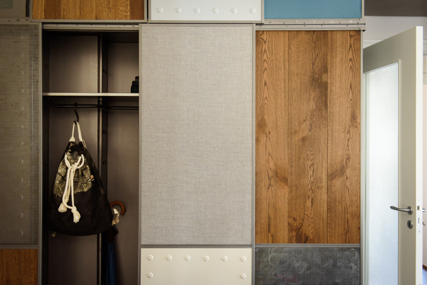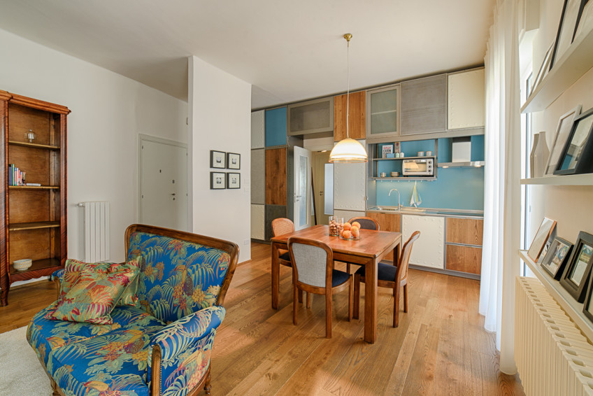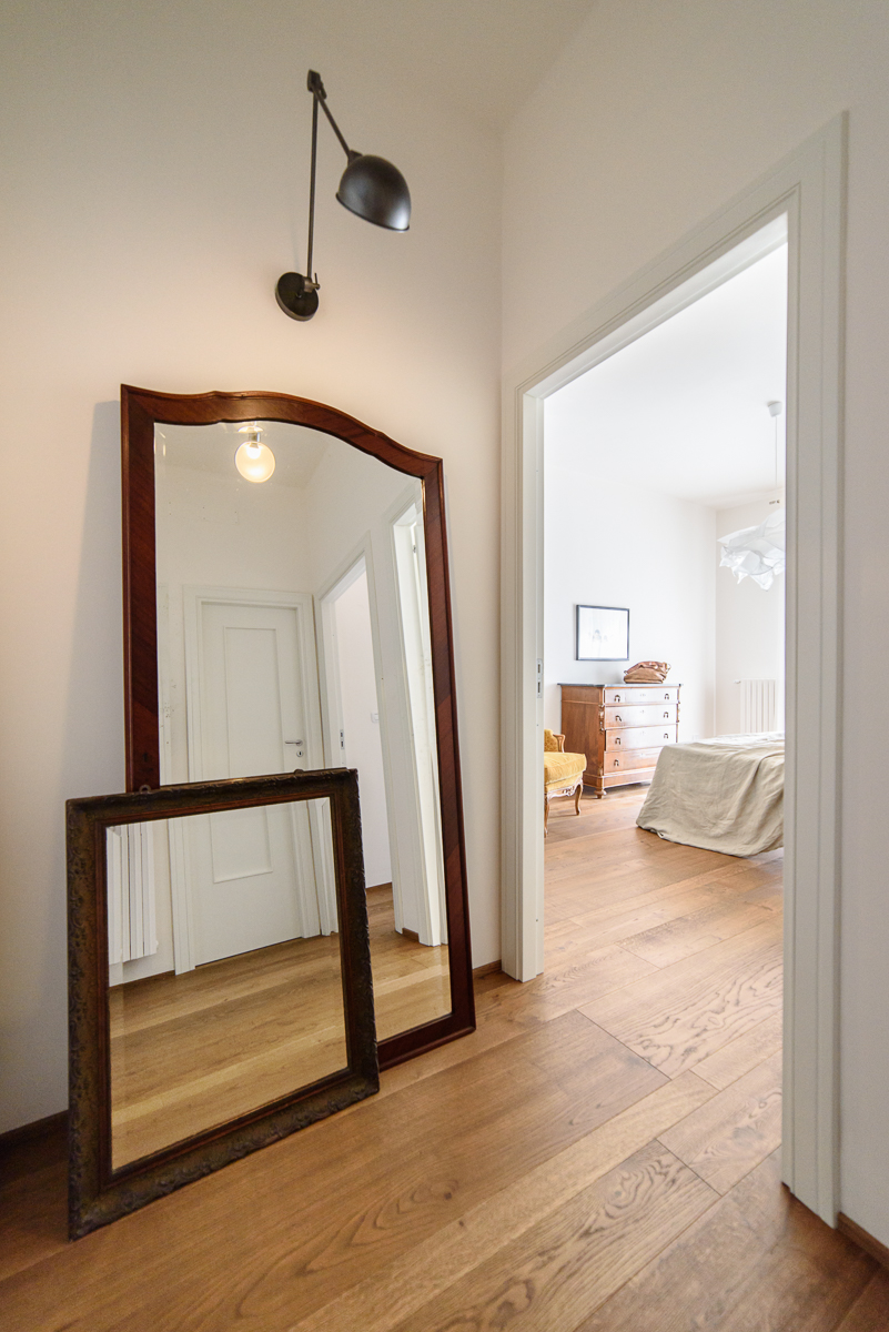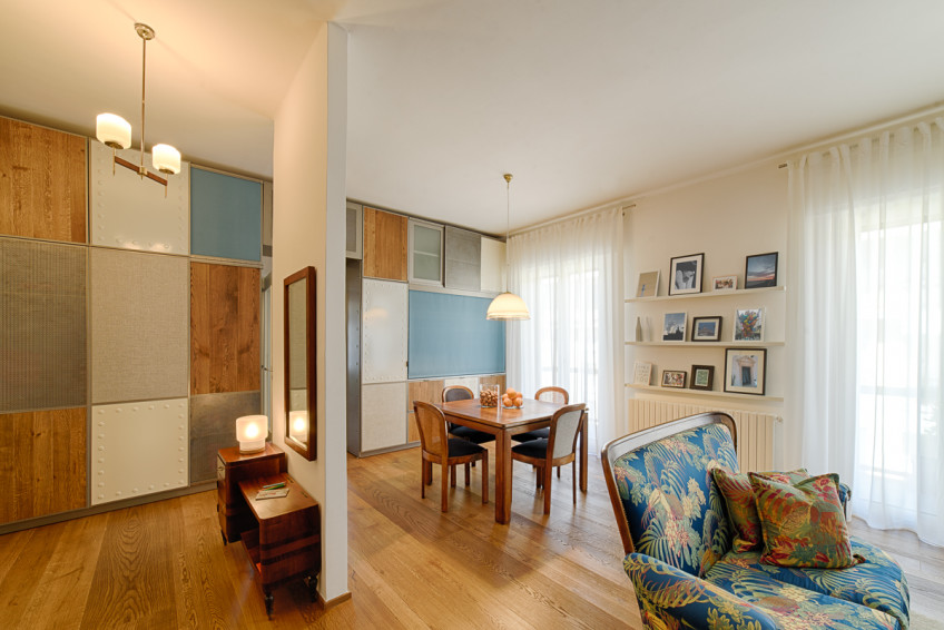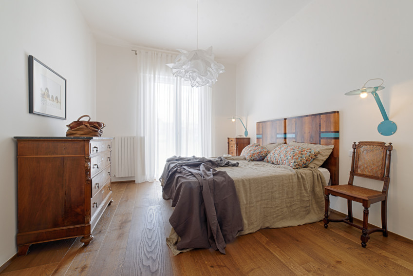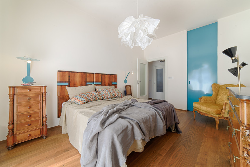 Una casa ci deve assomigliare, deve dire chi siamo. E questa casa che ho progettato per una donna speciale, piena di interessi, fragile e fortissima allo stesso tempo, elegante e informale, ricca di tante sfumature, io credo le somigli. Molto. Nella zona giorno, la parete attrezzata in cui ho mixato materiali molto diversi tra loro (ferro, vetro, legno, tessuto) nasconde la cucina, dietro a un rettangolo di tessuto. In un attimo, così, la zona living diventa sala da pranzo. Il romanticismo dei vecchi mobili di famiglia, rivisitati, vive in totale armonia con la modernità delle lamiere verniciate. Il legno antico del letto viene attraversato da una striscia di vernice turchese. Tutti gli elementi che ci sono in questa casa convivono in un contrasto armonioso.