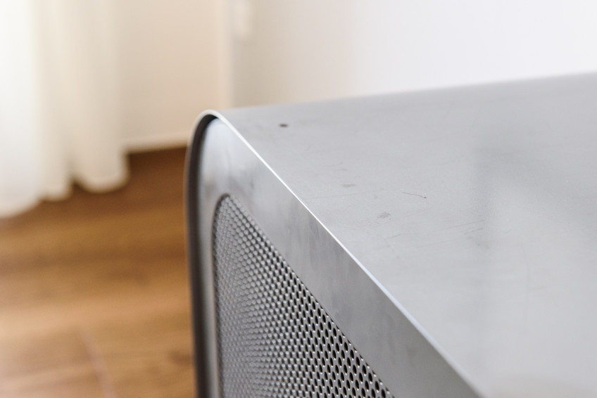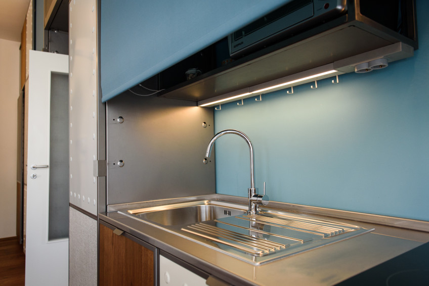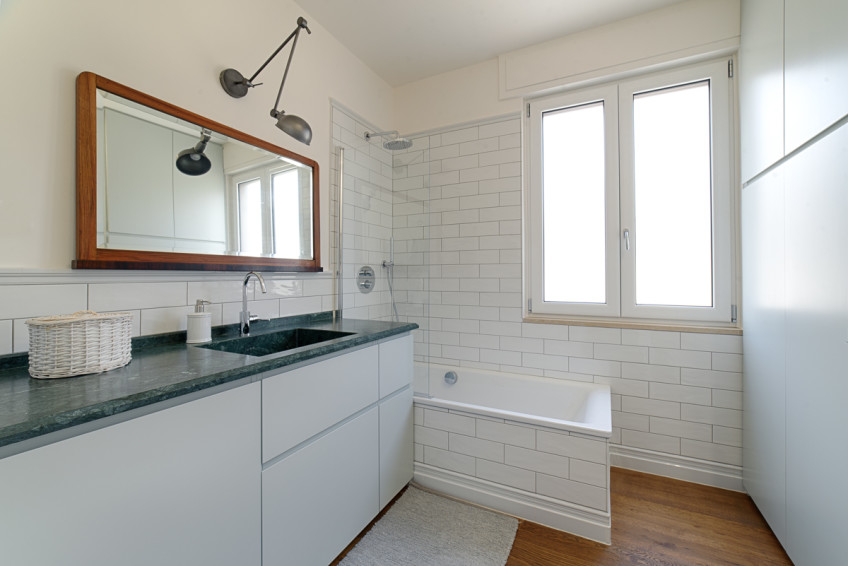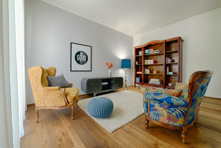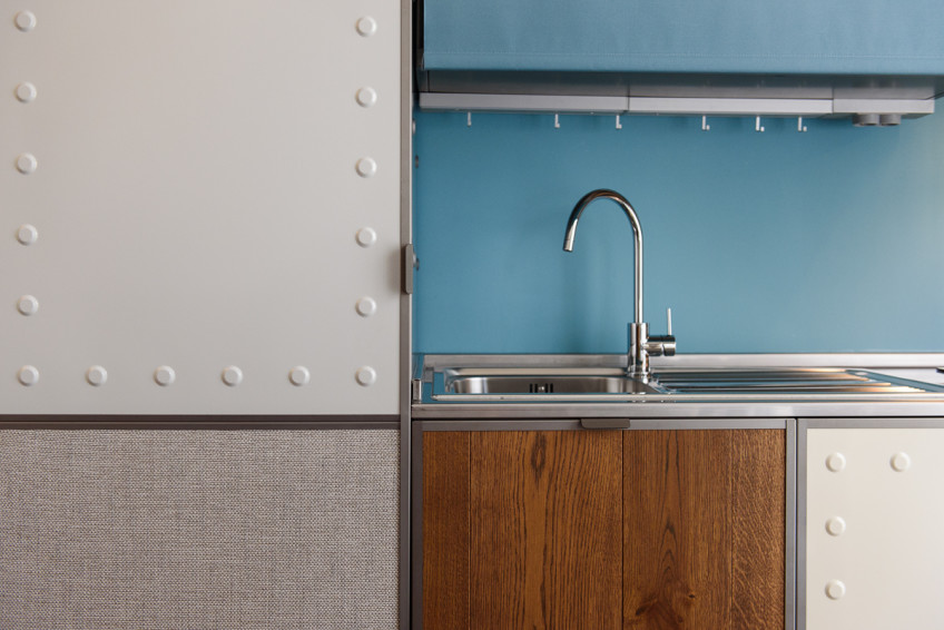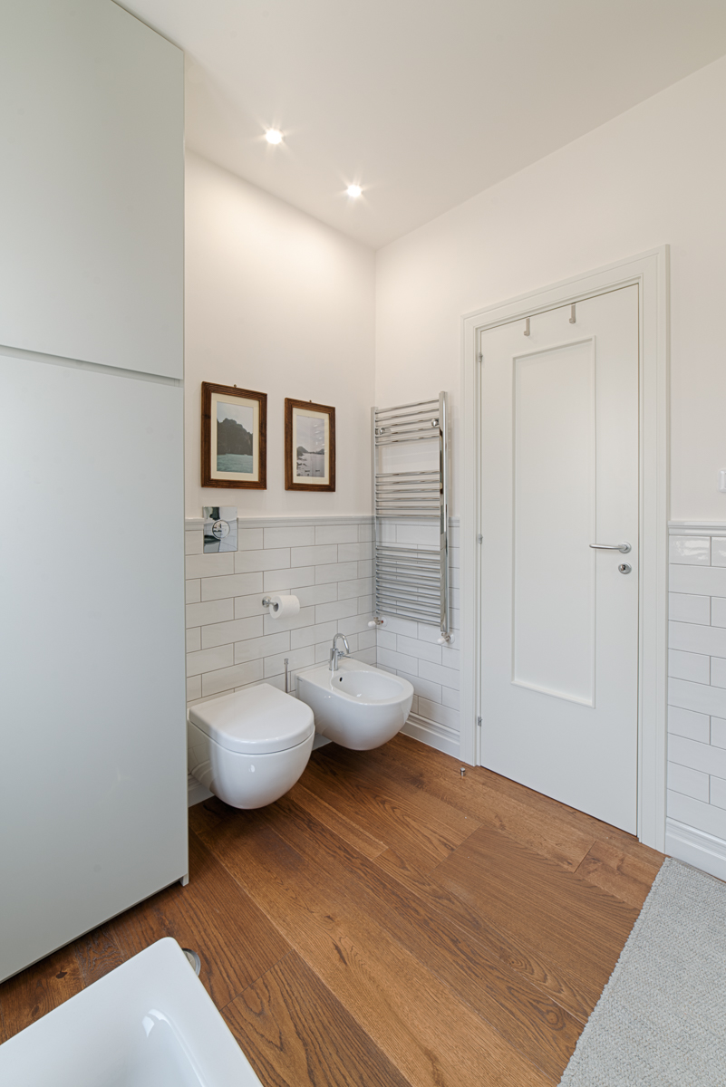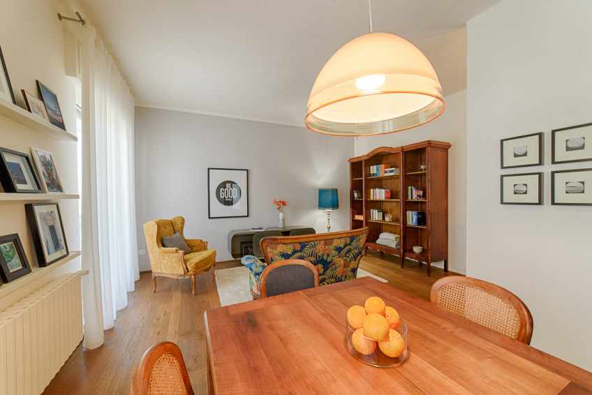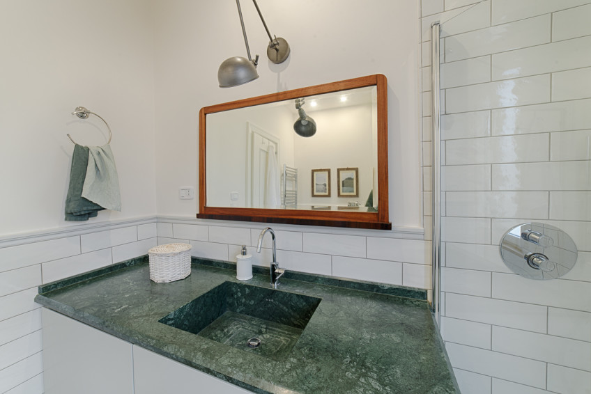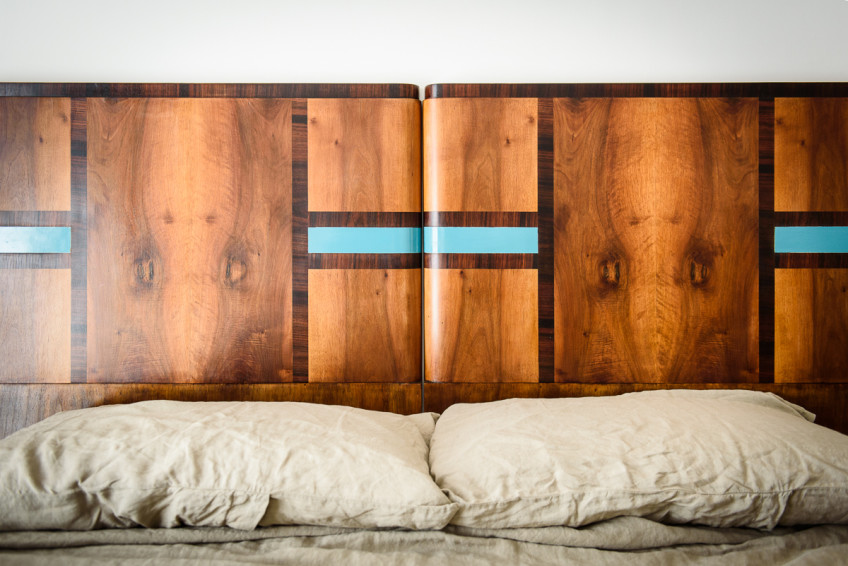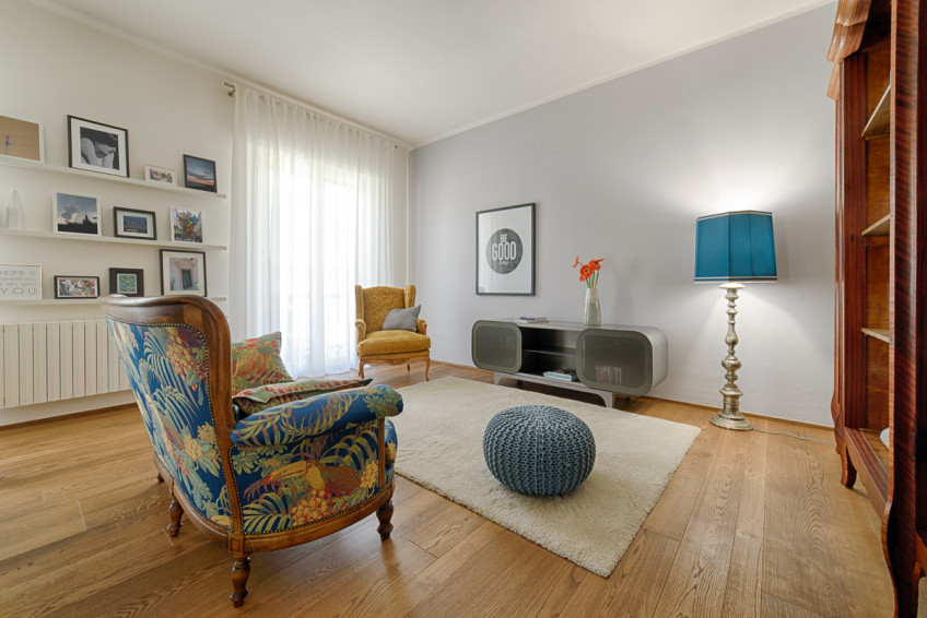 Una casa ci deve assomigliare, deve dire chi siamo. E questa casa che ho progettato per una donna speciale, piena di interessi, fragile e fortissima allo stesso tempo, elegante e informale, ricca di tante sfumature, io credo le somigli. Molto. Nella zona giorno, la parete attrezzata in cui ho mixato materiali molto diversi tra loro (ferro, vetro, legno, tessuto) nasconde la cucina, dietro a un rettangolo di tessuto. In un attimo, così, la zona living diventa sala da pranzo. Il romanticismo dei vecchi mobili di famiglia, rivisitati, vive in totale armonia con la modernità delle lamiere verniciate. Il legno antico del letto viene attraversato da una striscia di vernice turchese. Tutti gli elementi che ci sono in questa casa convivono in un contrasto armonioso.