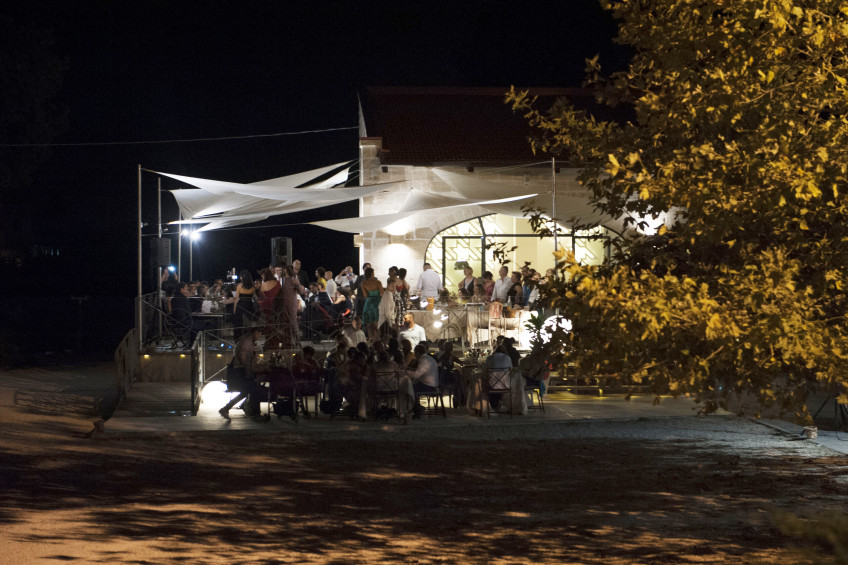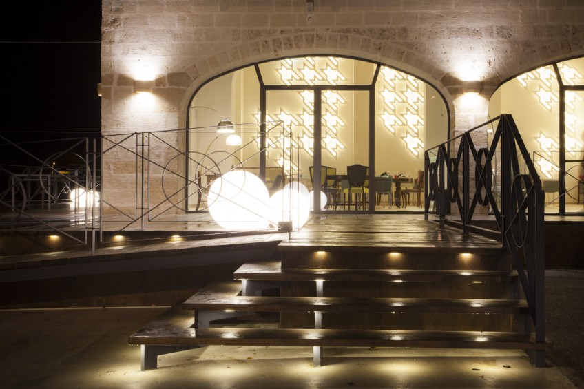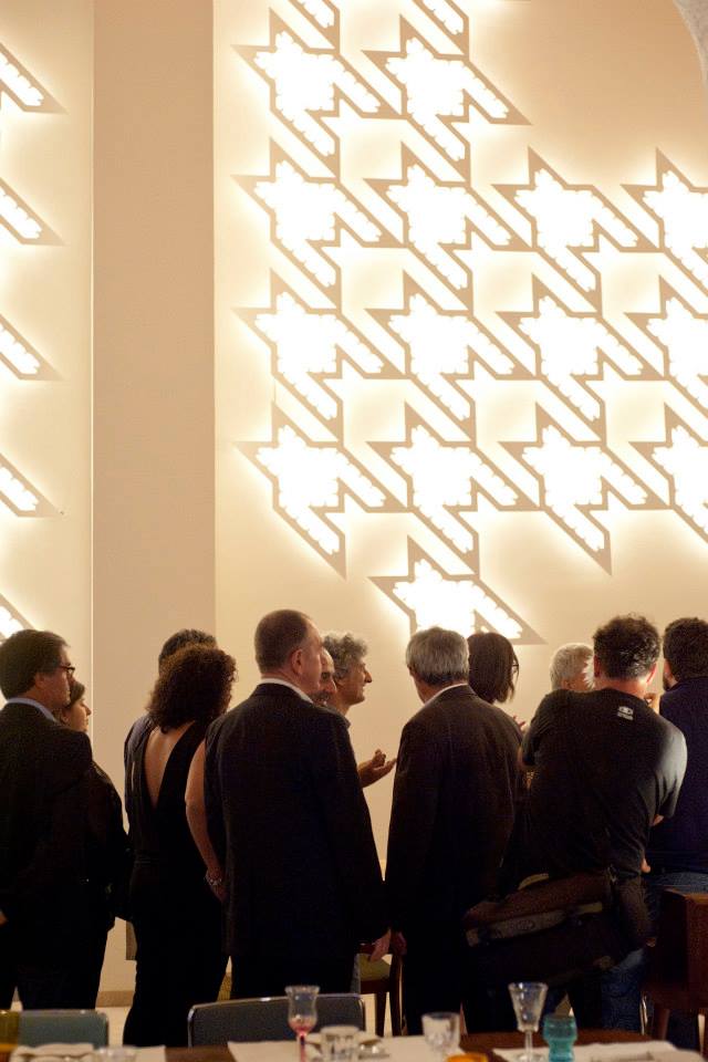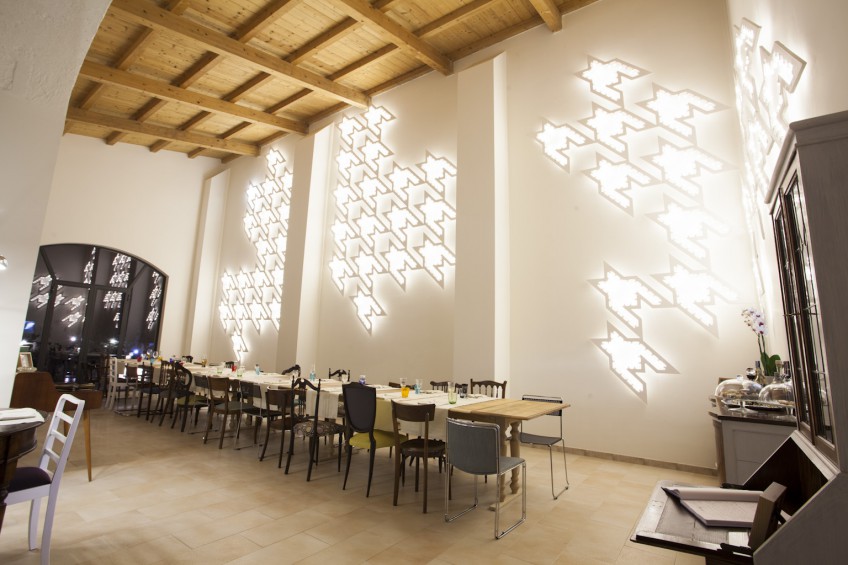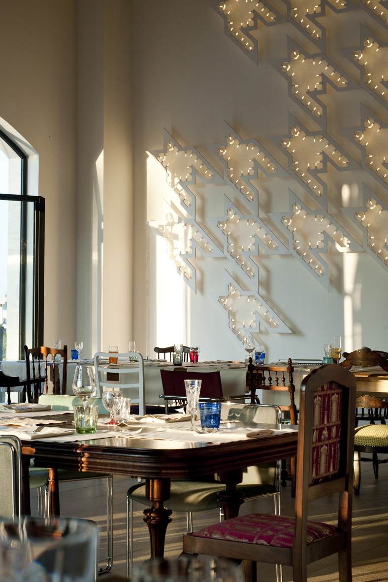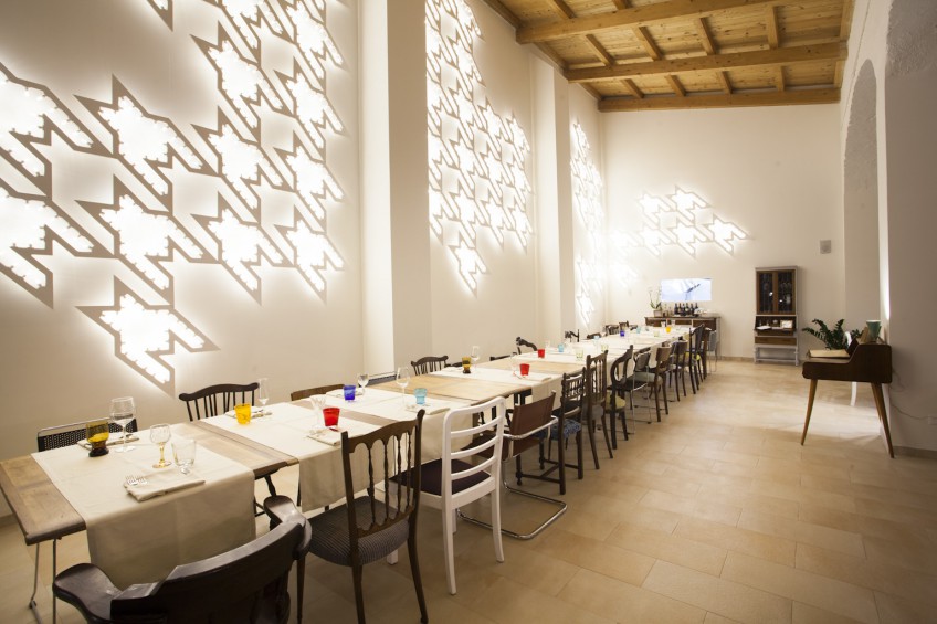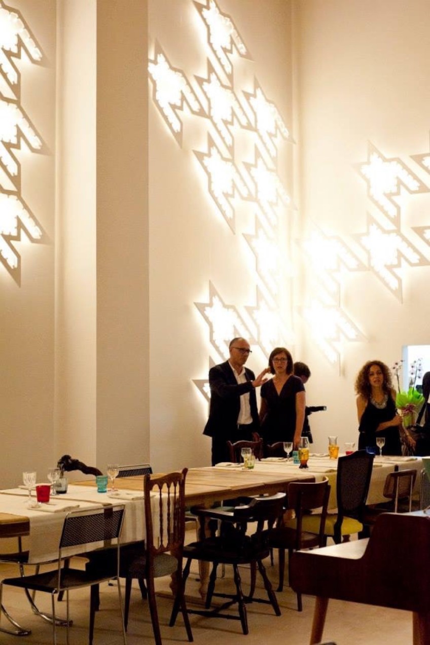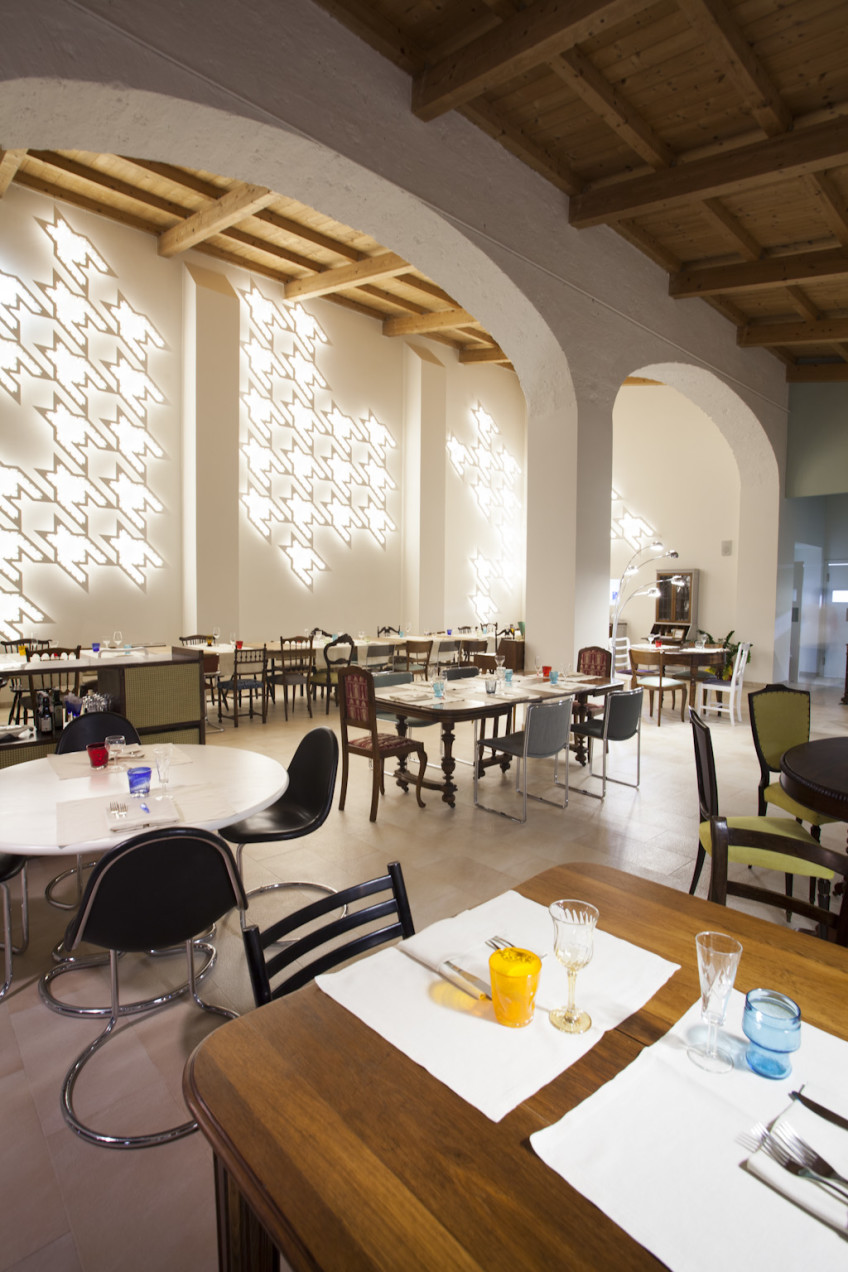 Il concetto su cui si basa tutto il progetto è la diversità come valore. A questo concetto mi sono ispirata per gli allestimenti. Ogni tavolo, ogni sedia, ogni piatto o bicchiere sono tutti diversi tra loro. Per l’illuminazione ho lavorato sulle luminarie, tipiche illuminazioni per le feste di paese, ridisegnandole con una texture pied de poule e appendendole alle pareti, come un enorme tessuto luminoso.